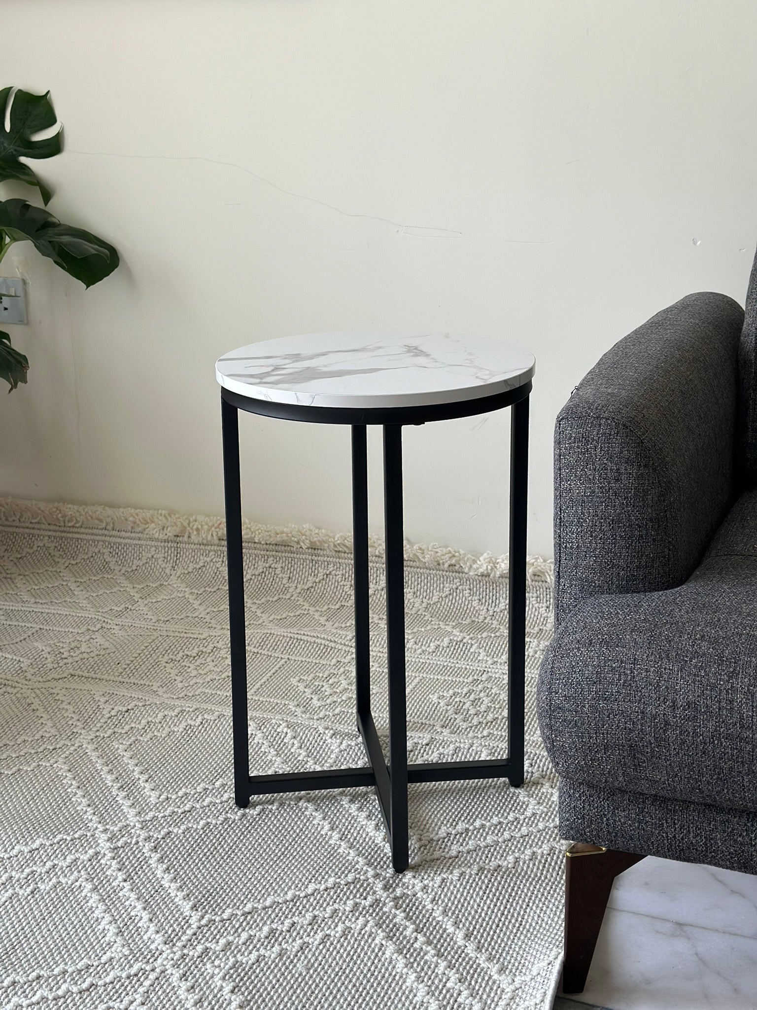 Elevate your space with this elegant round side table featuring a sleek white marble-effect top with soft grey veining. Supported by a modern matte black metal base, it adds a sophisticated touch to any living room, bedroom, or reading corner. Ideal for holding your coffee, books, or decorative accents.