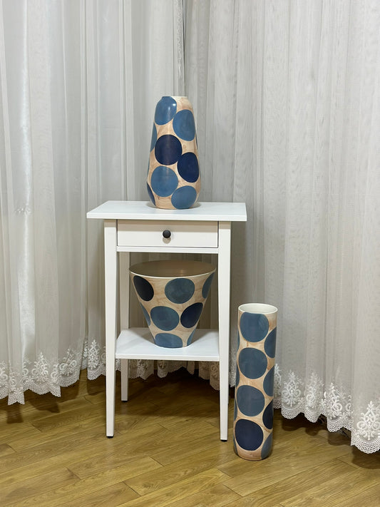 Tall Polka Dot Floor Vase – Hand-Painted Blue on Natural Wood Vase CODE 0273