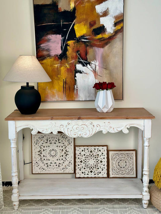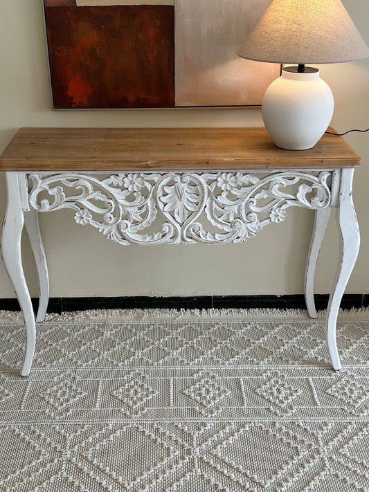 Hand-Carved Floral Console Table – White with Natural Wood Top Vintage Consul Length 111 cm X Height 77 cm X Depth 40 cm