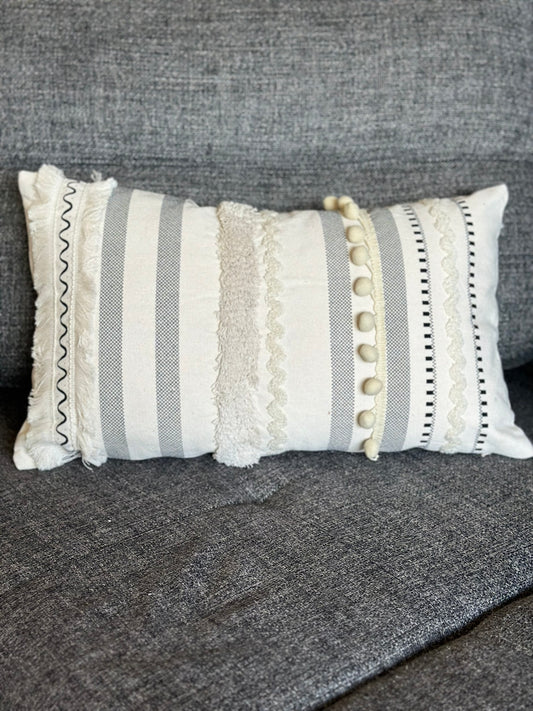Modern Boho Textured Cushion Set – Black & Cream Striped with Playful Details CODE 3310