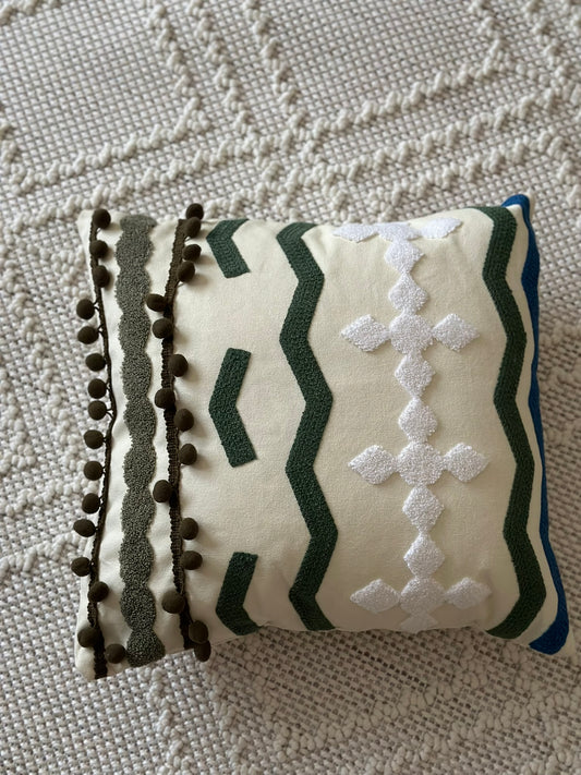 Ethnic Green & White Embroidered Cushion with Pom-Pom Trim CODE 3323 W&G
