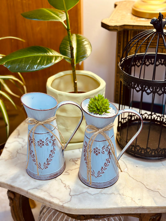 Vintage Metal Jugs with Heart Embossing – Rustic Blue